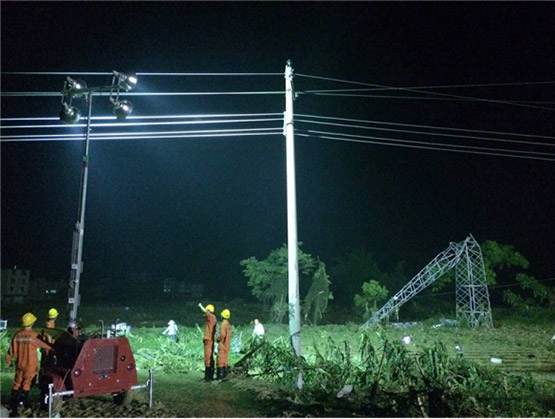 由于自然災(zāi)害帶來的局部區(qū)域的電力癱瘓,在救援和安置災(zāi)民的同時,需要立刻恢復(fù)當(dāng)?shù)負(fù)p害的電力系統(tǒng),現(xiàn)場照明需要亮度高、照射面積廣,且在沒有市電情況下需要燈具能夠采用自發(fā)電形式,滿足現(xiàn)場搶修需求。